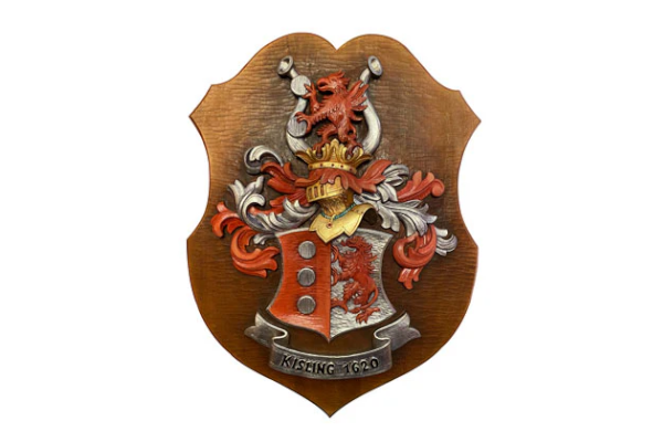 Aufwändig geschnitztes Wappen, nach historischer Vorlage, anschließend vom Fassmaler per Hand coloriert.